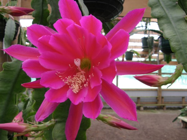 Erste Reihe der inneren Petalen purpur-rosa. Nächte Reihe dunkel purpur-rosa mit schmalen hell rosa Rändern. Äussere Petalen purpur-rosa mit dunkler rosa-rotem Mittelstreifen. |