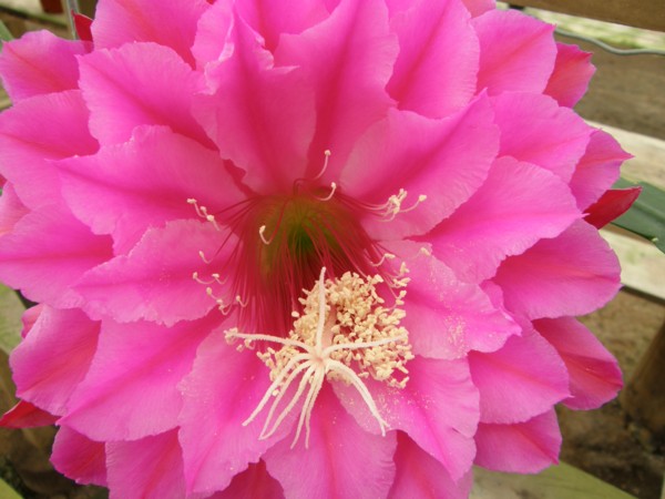 erste Reihe der inneren Petalen purpurrosa mit dunkel rosaroten Rändern. Nächste drei Reihen purpur rosa mit dunklerem Mittelstreifen. Grüner Schlund mit violett-rosa Rändern. Äussere Petalen purpur. |