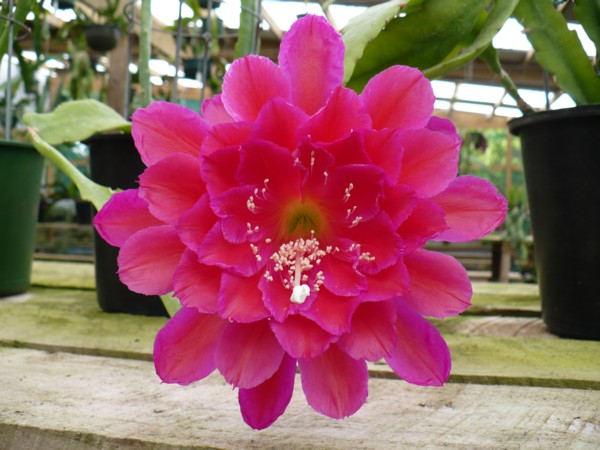 erste Reihe der inneren Petalen rot mit purpurrosa Rändern. Nächste Reihen dunkel rosarot mit purpurrosa Rändern. |