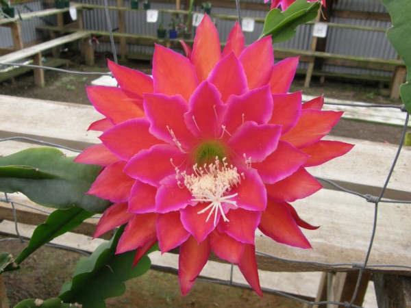 erste Reihe der inneren Petalen rot mit purpurrosa Rändern. Nächste Reihen orange mit purpurrosa Rändern. Äussere Petalen purpur mit rotem Mittelstreifen. |
