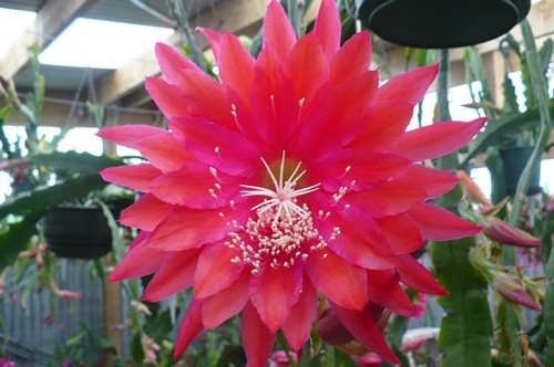 erste Reihe der inneren Petalen dunkel rosarot mit purpurroten Rändern. Zweite Reihe dunkel rosarot mit purpurrosa Rändern im Schlund. Dritte und vierte Reihe orange-rot mit purpurrosa Schlund. Vierte Reihe untere Hälfte purpurrosa, Mittelstreifen und obere Hälfte orangerot. Äussere Petalen dunkel rosarot mit dunkleren Rändern. |