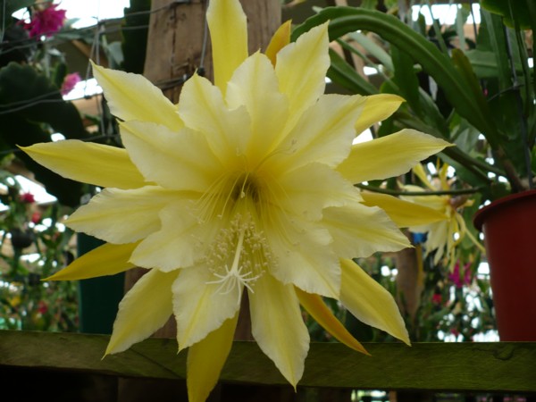 innere Petalen gelb mit dunkler gelbem Mittel-streifen und weiteren Streifen. Nächste zwei Reihen hell gelb mit dunkler gelbem Mittelstreifen und Rändern. Äussere Petalen gelb mit etwas dunkel orangen Streifen. |