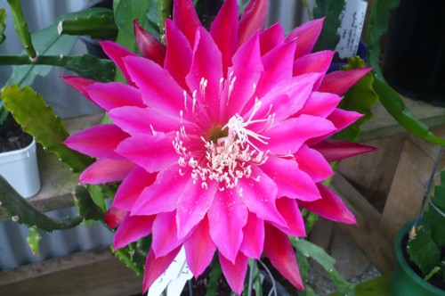 erste Reihe der inneren Petalen dunkel rosarot mit purpurrosa Rändern. Nächste drei Reihen purpurrosa mit dunkel rosarotem Mittelstreifen. Letzte Reihe purpurrosa mit zart purpurrosa Rändern. Äussere Petalen pupur mit dunkel rosarotem Mittelstreifen. |