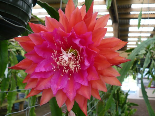 erste zwei Reihen der inneren Petalen orange-rot mit dunkelrosa Rändern. Nächste Reihe orange-rot mit purpur-rosa Rändern. Äussere Petalen orange-rot mit roten Rändern. |