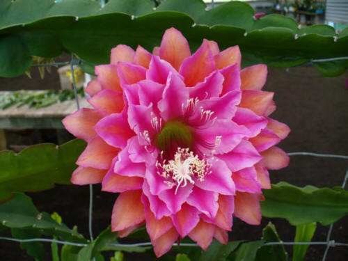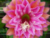 Innere Petalen hellorange mit purpur-rosa Rändern. Nächste Reihe hellorange mit breitem purpur-rosa Mittelstreifen. Nächste Reihe purpur-rosa mit hell rosa Rändern. Äussere Petalen dunkel rosa-rot mit gelb-grünem Mittelstreifen. |