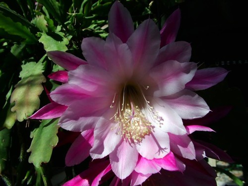 fast weiß mit hell nelkenfarbenem Mittelstreifen, äußere Petalen purpur-rot |