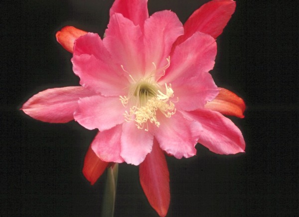 gesprenkelt, garnelenrosa mit hellerem Schlund und gewellten Rändern, nächste Reihe dunkler mit orange gesprenkelt, äußere Petalen goldorange mit pink gesprenkelt |