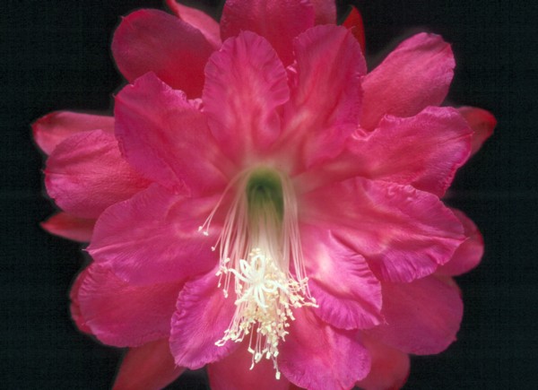 1.Reihe orange mit leicht kirschroten Rändern, 2.Reihe garnelenrot mit weißem Mittelstreifen, weißer Schlund, äußere Petalen garnelenrot |