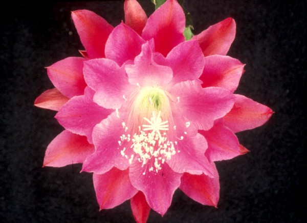 kräftig kirschrot mit hellerem Schlund, geädert mit dunklem kirschrot, nächste Reihe karmin mit kirschrot geädert und leicht rotem Mittelstreifen, äußere Petalen kastanienbraun mit rotem Mittelstreifen |