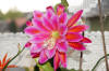 purpur mit lavendelfarbenen Rändern und orangem Mittelstreifen. Gekräuselt. Äussere Petalen orange mit rot bis purpur Rändern. |