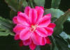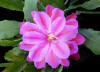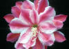 gewellt, kräftiges kirschrot mit lachsrotem Mittelstreifen und hell lavendelfarbenen gekräuselten Rändern, äußere Petalen kräftig lachsrot mit kirschfarbenen Rändern |