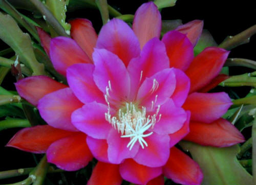 rot mit fuchsienroten bis orangefarbenem Mittelstreifen, innerste Petalen komplett fuchsienrot |