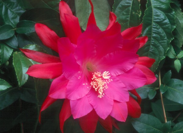 feuriges pink mit orangem Mittelstreifen, weiß im Zentrum der Petalen, äußere Petalen pink mit orange überhaucht |
