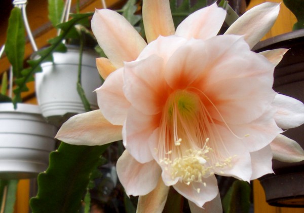 innere Petalen zart pfirsich-rosa mit rotem Schlund. Äussere Petalen mittleres orange-rosa. |