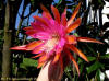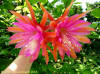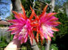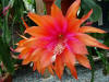 Innerste Petalen orange mit magenta Schlund. Nächste Reihe orange mit dunkler orange Mittelstreifen. Äussere Petalen rötlich orange |