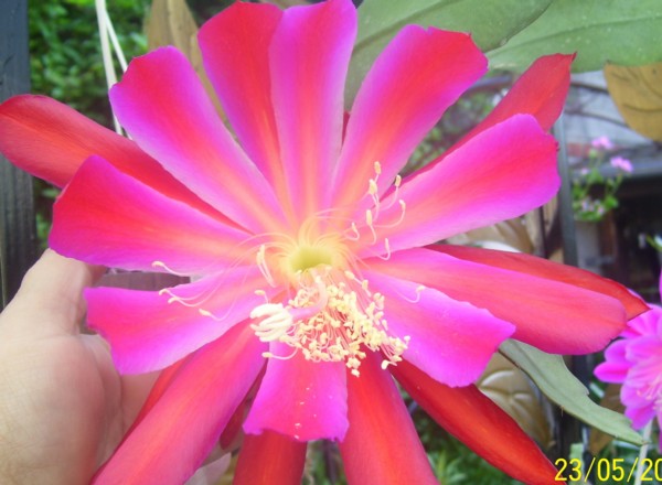 hell magenta mit orangem Mittelstreifen und hellrosa Schlund. |