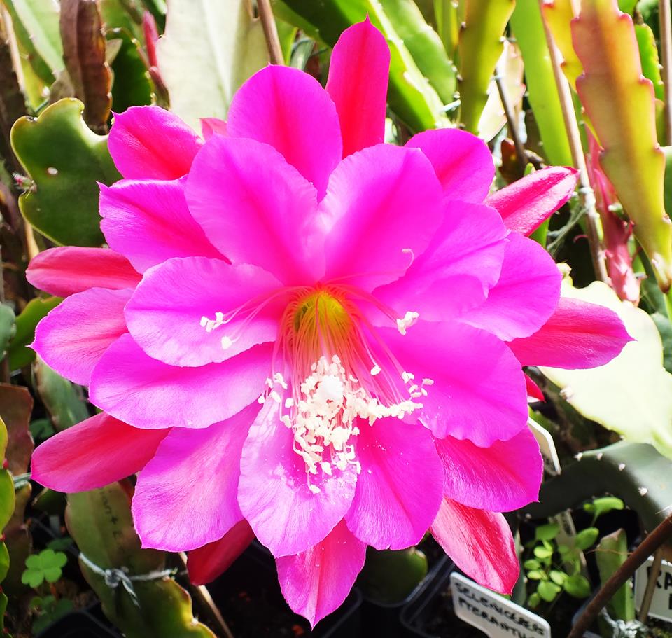 fuchsia bis zart lavendelfarben mit dunkel-rotem bis purpur Mittelstreifen. Gekräuselt. Äussere Petalen dunkel rot. |