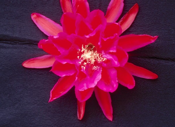 gewellte Petalen in dunkel rot mit kirschroten Rändern, nächste Reihe dunkel rot mit hellerem Mittelstreifen und kirschroten Rändern, äußere petalen dunkel rot mit dunkel karminfarbenen Ränd |
