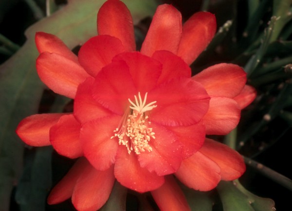 innere Petalen goldorange mit kirsch-roten inneren Rändern, Petalen gebogen, nächste Reihe ähnlich mit schmaleren kirschroten Rändern, äußere Petalen dunkler goldorange |