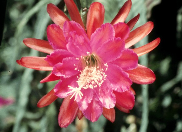 orange schattiert zu kirschroten Rändern und Schlund, nächste Reihe ein Mix von orange und kirschrot, äußere Petalen dunkles orange mit kirschroten Rändern |