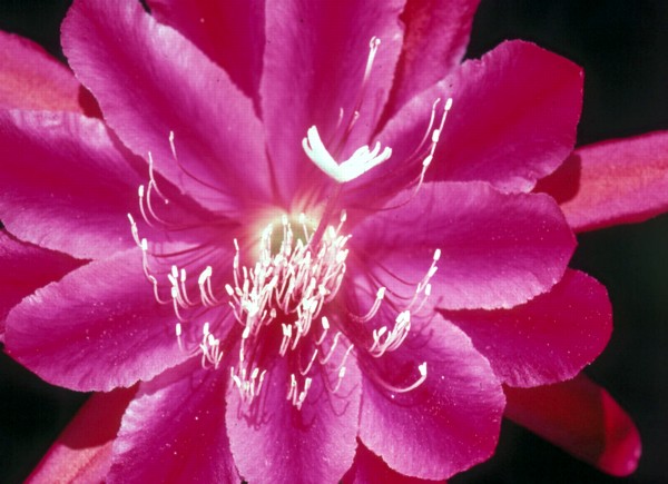 dunkel rot mit goldorangenem Mittelstreifen, fuchsienfarbener Schlund und Ränder |
