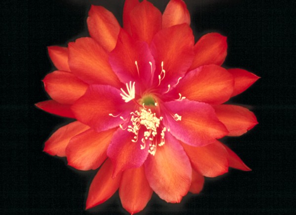 orange mit magenta Schlund, äußere Petalen rot mit orangem Mittelstreifen |