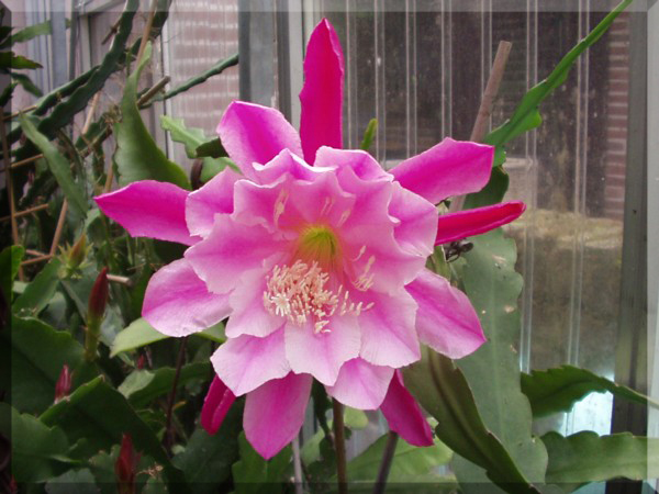 innere Petalen weiß mit pinkfarbenem Mittelstreifen, 2. Reihe mehr pink, äußere Petalen dunkles pink mit orangem Mittelstreifen |