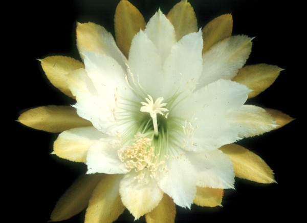 weiß mit gezackten Rändern, äußere Petalen creme-gelb-weiß |