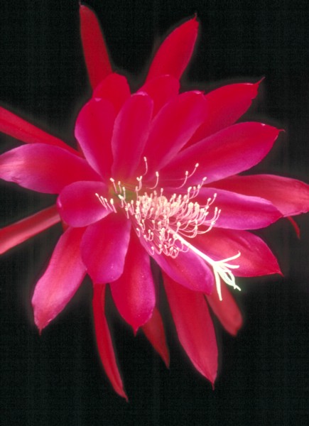 1.Reihe schwach magenta mit dunklerem Mittelstreifen, 2.Reihe dunkel magenta mit rotem Mittelstreifen und wenig magenta in den Rändern, äußere Petalen rot |