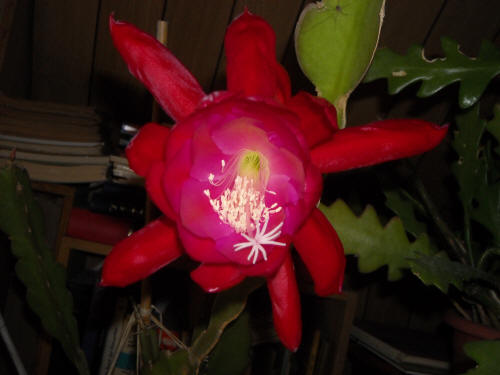 linnere Petalen leuchtend violett mit rotem Mittelstreifen, äussere Petalen leuchtend rotorange |