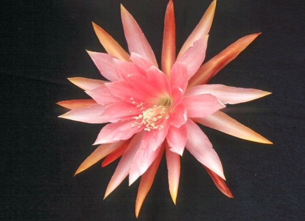 kurze innere Petalen in pfirsichfarben mit korallenfarbener Äderung, nächste Reihe heller, ein paar gelbe Tupfen, äußere Petalen pfirsichfarben mit goldgelben Rändern |
