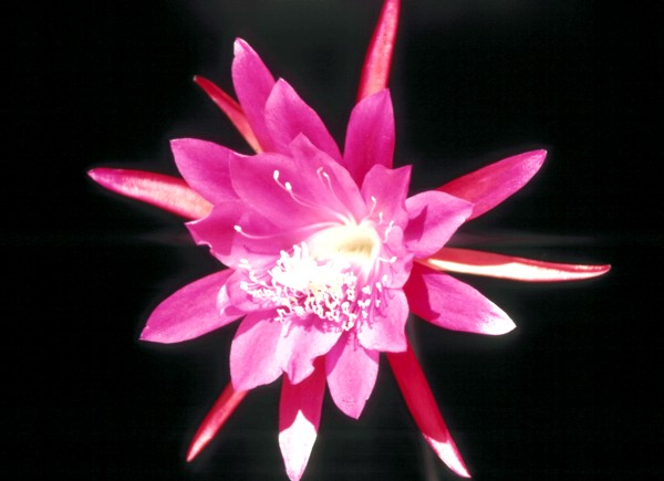 kirschrot mit karminfarbenem Mittelstreifen, äußere Petalen karmin mit orange |