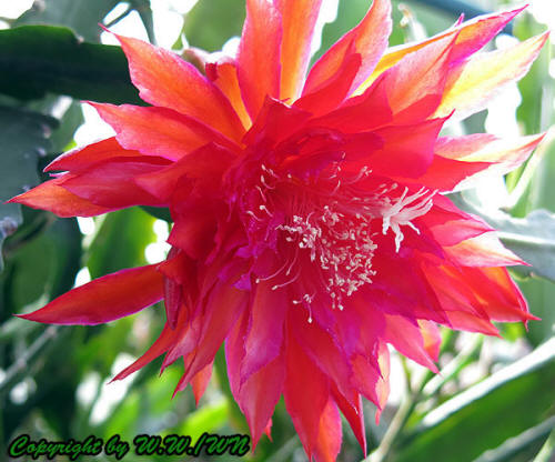 zartes rot mit fuchsienfarbenen Rändern, äußere Petalen rot schattiert |