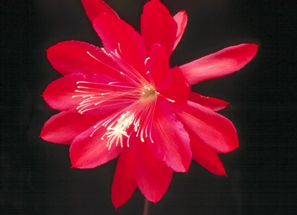 dunkel rot mit orangerotem Mittelstreifen und ein wenig gezackt an den karminfarbenen Rändern, äußere Petalen dunkel rot mit dunkel karmin an den Rändern |