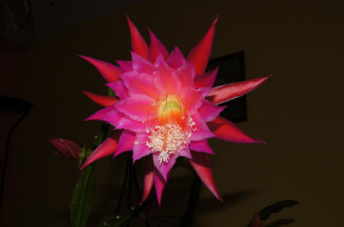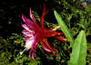 lila mit rosa-orangem Mittelstreifen und cremeweissen Rändern. Äussere Petalen orange-rot. |