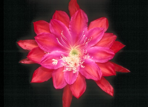 hell orange mit rötlich-orangen Rändern, magentafarbener Schlund, äußere Petalen orange mit roten Rändern |