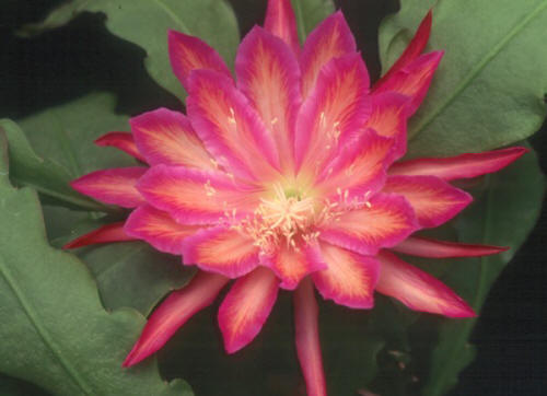 dunkel pink-lavendel mit orangem Mittelstreifen, äußere Petalen dunkler lavendel mit orangem Mittelstreifen |