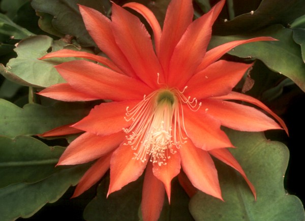 lachs-pink mit breitem orangem Mittelstreifen, äußere Petalen lachs-pink mit orangem Mittelstreifen |