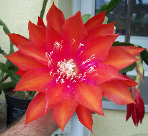 kräftig karmin mit kirschroten Rändern und rot-orangem Mittelstreifen, nächste Reihe dunkel rot-orange mit karmin schattiert |