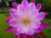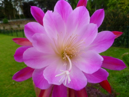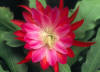 die ersten beiden Reihen helles pink mit kirschrotem Zentrum zum weißen Schlund, dritte und vierte Reihe oranges Zentrum mit ein wenig kirschrot, äußere Petalen dunkles orange mit kirschrot |