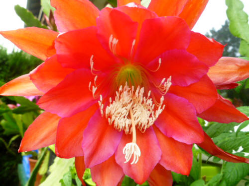 kräftig orange mit ein wenig magenta an den Rändern im weißen Schlund, äußere Petalen dunkel rotorange |