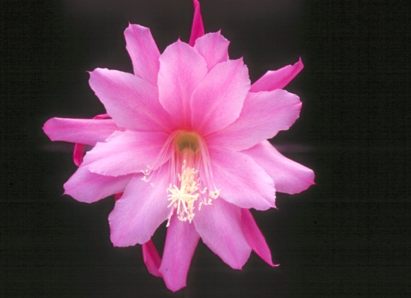 gerundete innere Petalen in kirschrot mit dunklerer Äderung und pfirsichfarbenem Mittelstreifen, äußere Petalen kirschrot mit karminfarbenem Mittelstreifen |