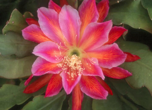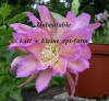 dunkel kirschrot mit hell lavendel Rändern, oranger Schlund, äußere Petalen dunkles magenta mit dunkel orangem Mittelstreifen |