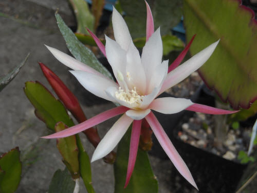 weiss mit rotem Schlund. Äussere Pe-talen dunkel rosa. |