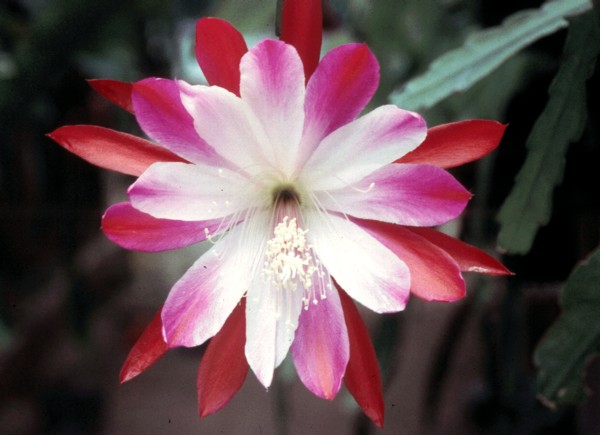 Weiß mit kirschroter Mitte. An über der Hälfte der Petalen, roter Mittelstreifen, nächste Reihe orangerot mit kirschroten Rändern und weißem Schlund, äußere Petalen orangerot mit leicht kirschrotem Mittelstreifen |