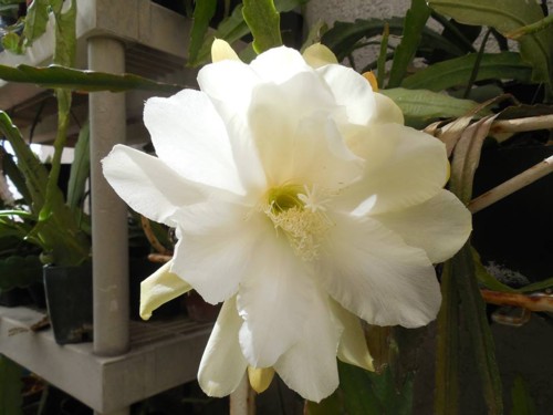 innere Petalen weiss mit durch-scheinenden gekräuselten Rändern. Die zwischenliegenden Petalen sind zart gelb mit rosa Schimmer und schwach gezackten Rändern. Äussere Petalen bronze-rosa. |